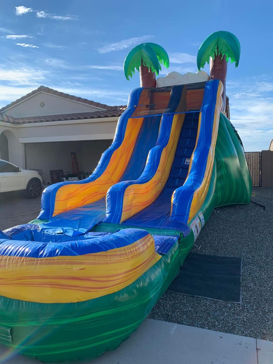 Our 17ft Tropical Waterslide is a party favorite! Have the perfect summer day with a fun and colorful slide! The palm trees even move in the wind like real palm trees! Book today!